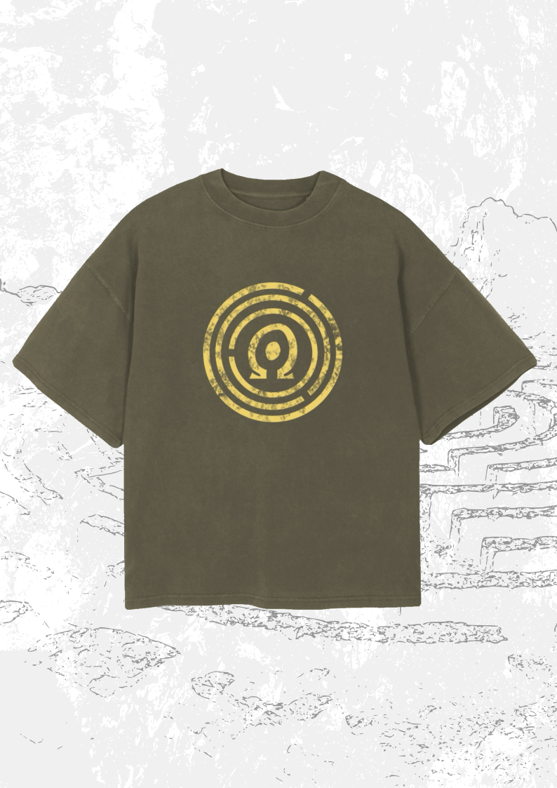 The tee features distressed printing reminiscent of the rugged wear of ancient artifacts one might have found traversing the maze during this time.